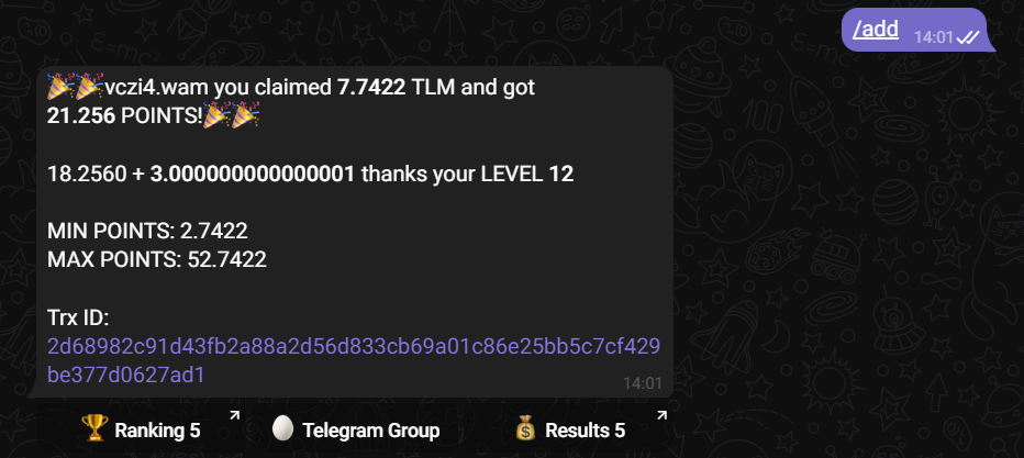 Claiming at least 5 TLM you get random POINTS between MIN and MAX. \